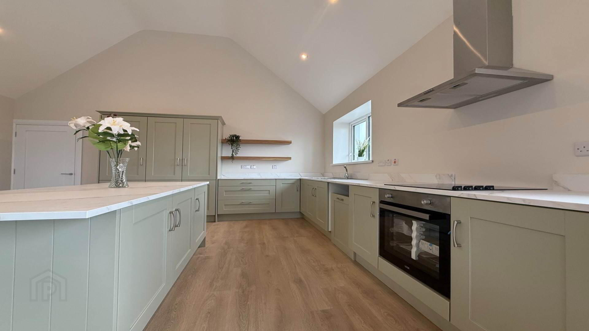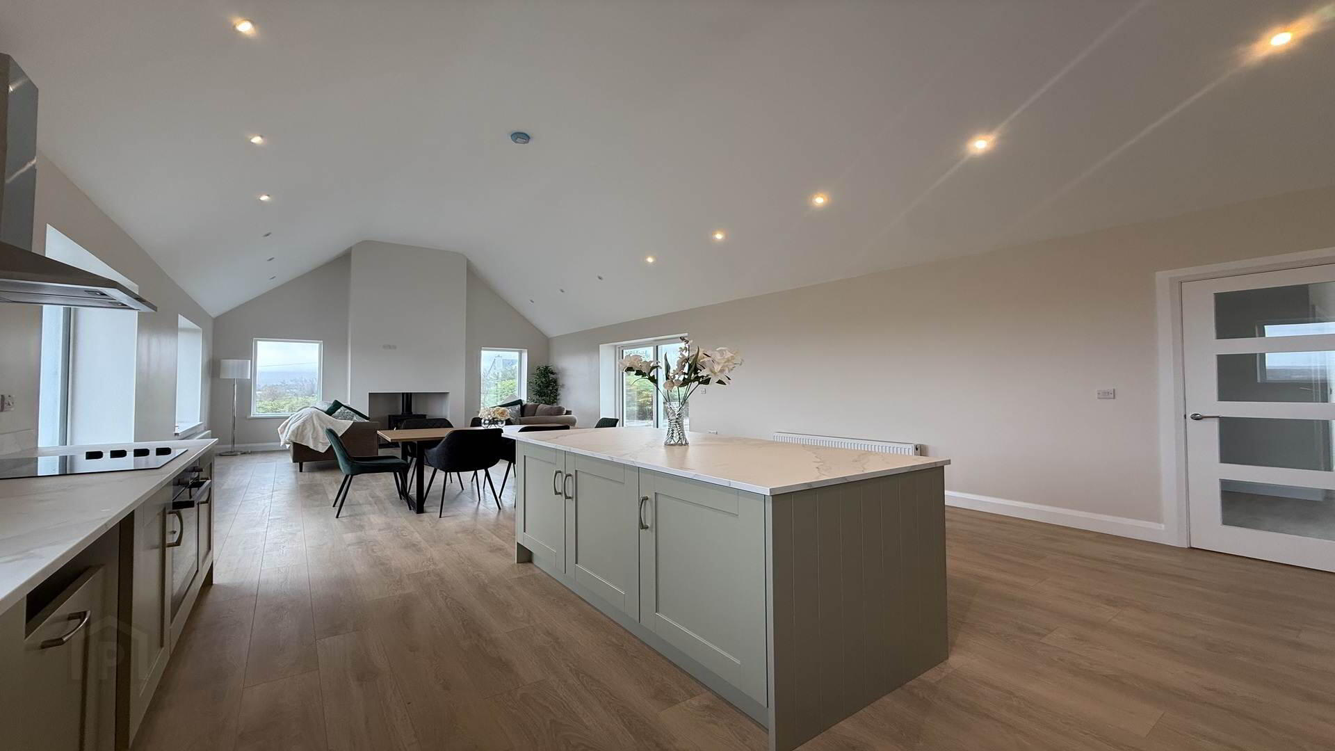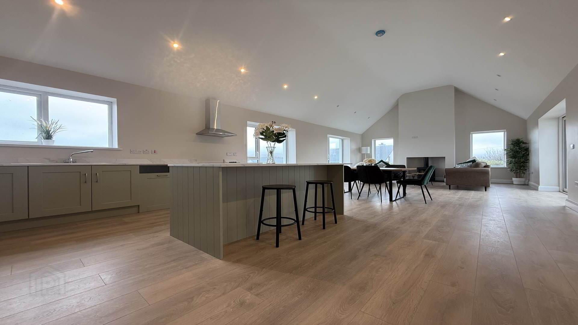 Open Plan, Fully Fitted Kitchen, Island, Soiled Fuel Stove, Laminate Wooden Floor, Sliding Door to Rear