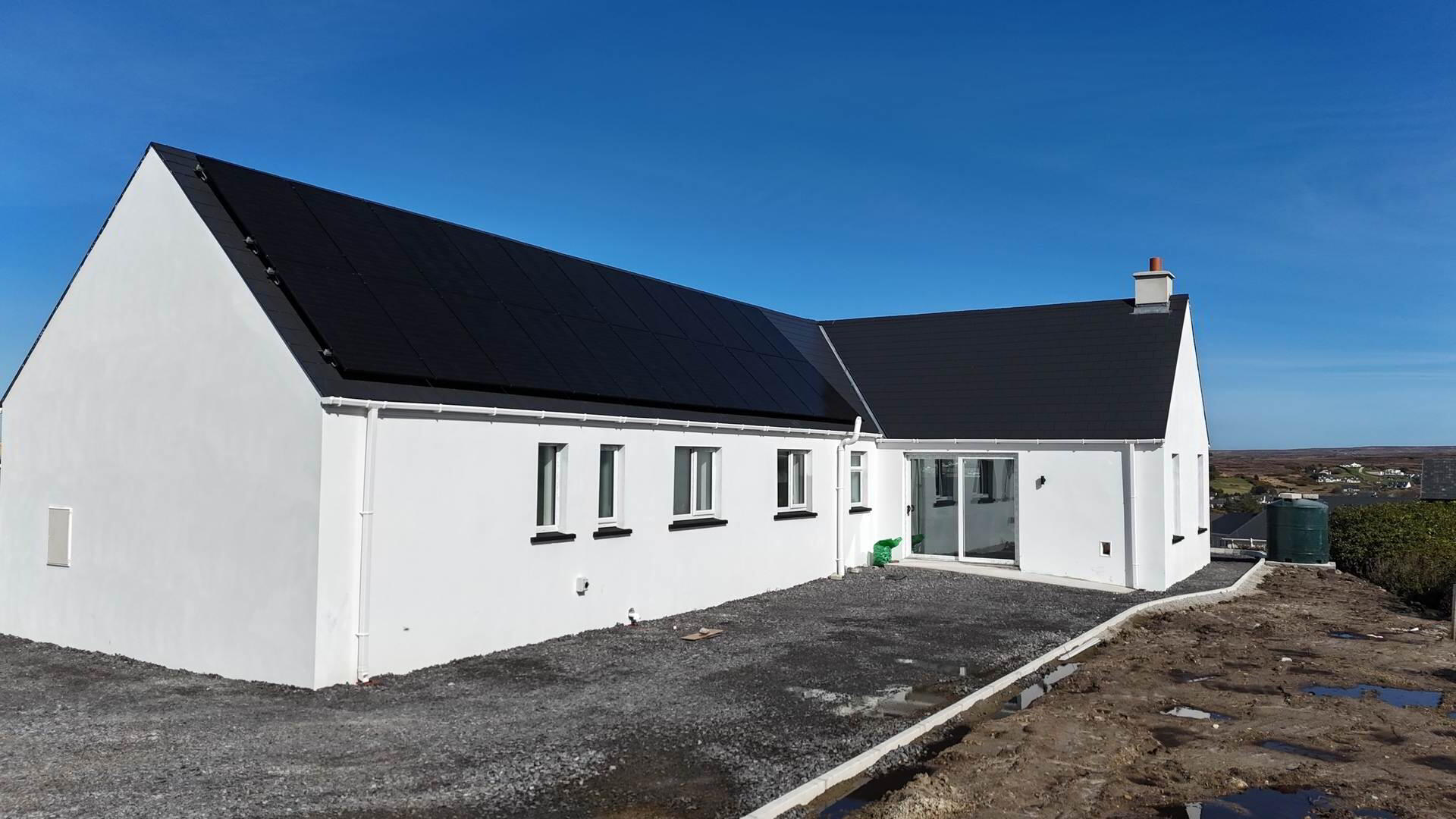 Externally, the Property features a crisp white finish complemented by a dark slate roof and a substantial array of roof-mounted solar panels.