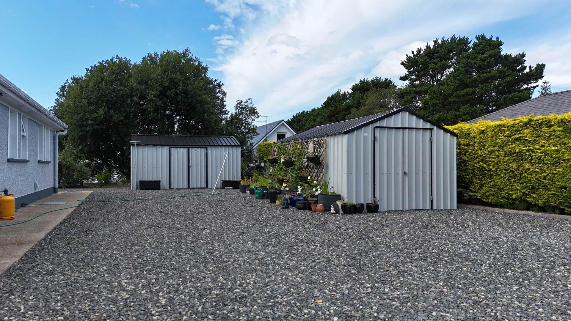 Externally, the property boasts ample parking, a generous garden, and two tin garden sheds offering excellent storage or workshop potential.