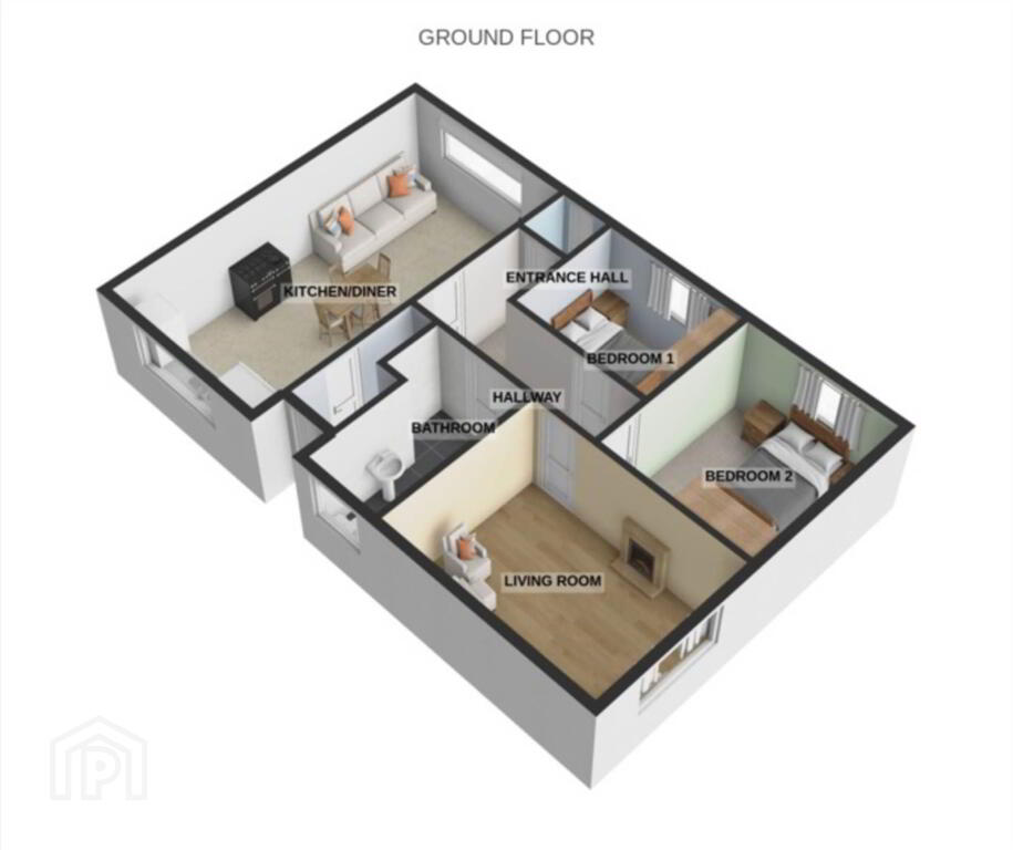 The accommodation comprises an entrance hall, an open plan kitchen, dining and lounge area, two bedrooms, a main bathroom, and a separate living room.